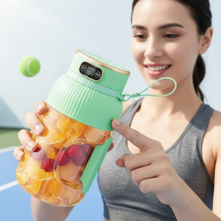 This image features a woman holding a pastel green portable blender bottle filled with oranges and raspberries. She is outdoors on a tennis court, smiling while interacting with the digital display on the lid. The blender includes a carrying strap and ergonomic handle, highlighting its convenience for active and on-the-go use.